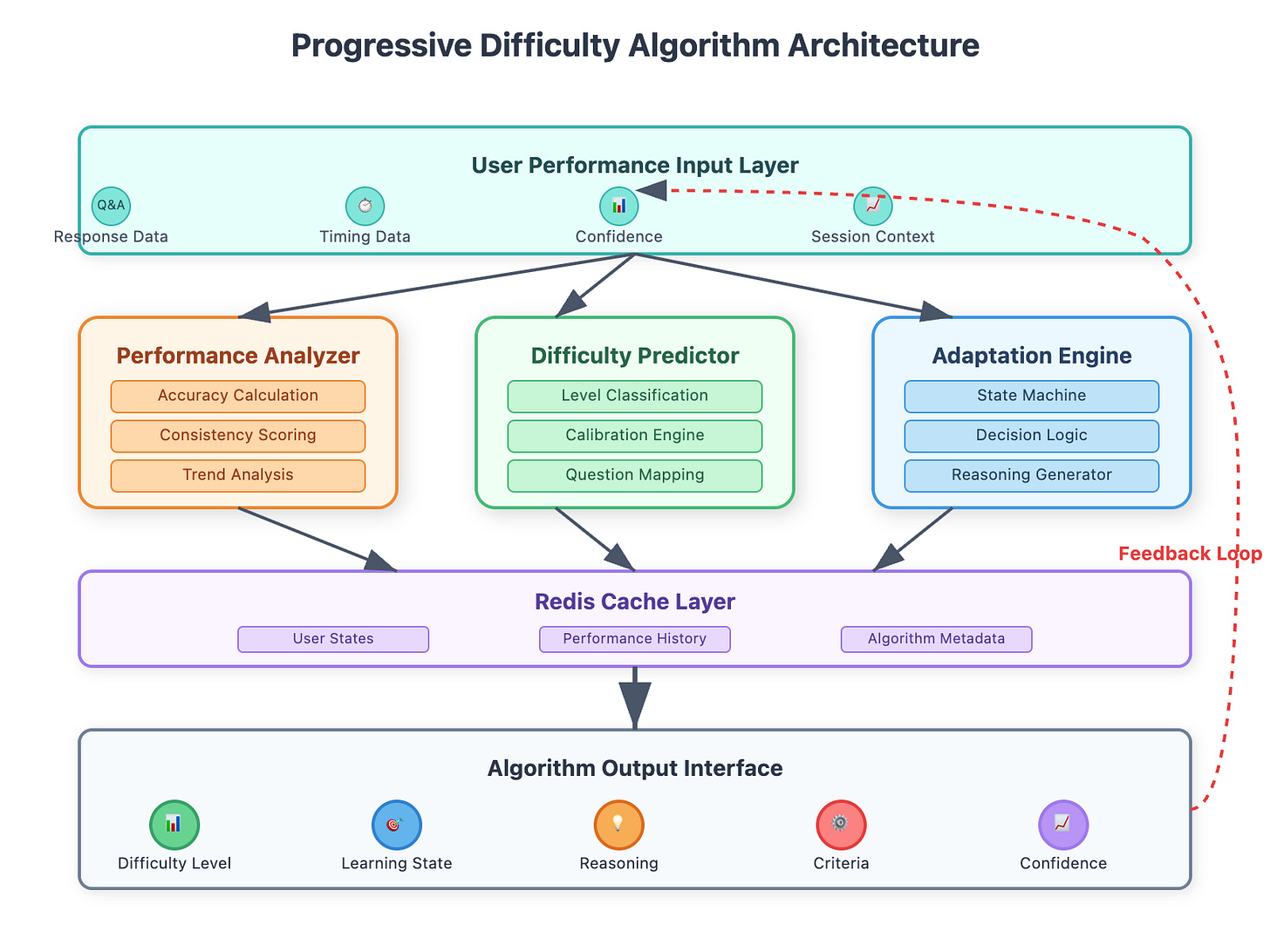 Our progressive difficulty algorithm sits at the heart of our distributed quiz system, consuming real-time performance data and making split-second decisions about what question to serve next. Unlike static systems, this component learns and adapts, creating unique learning paths for millions of concurrent users.