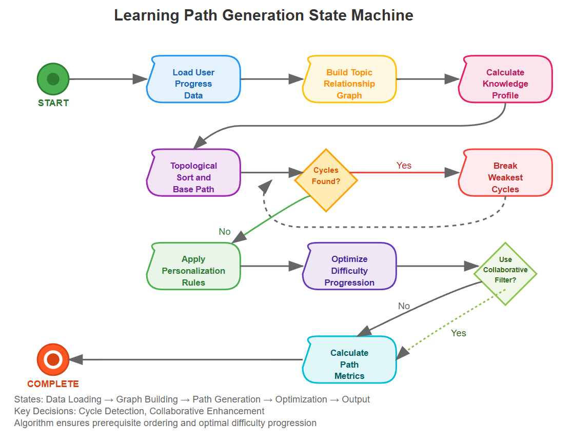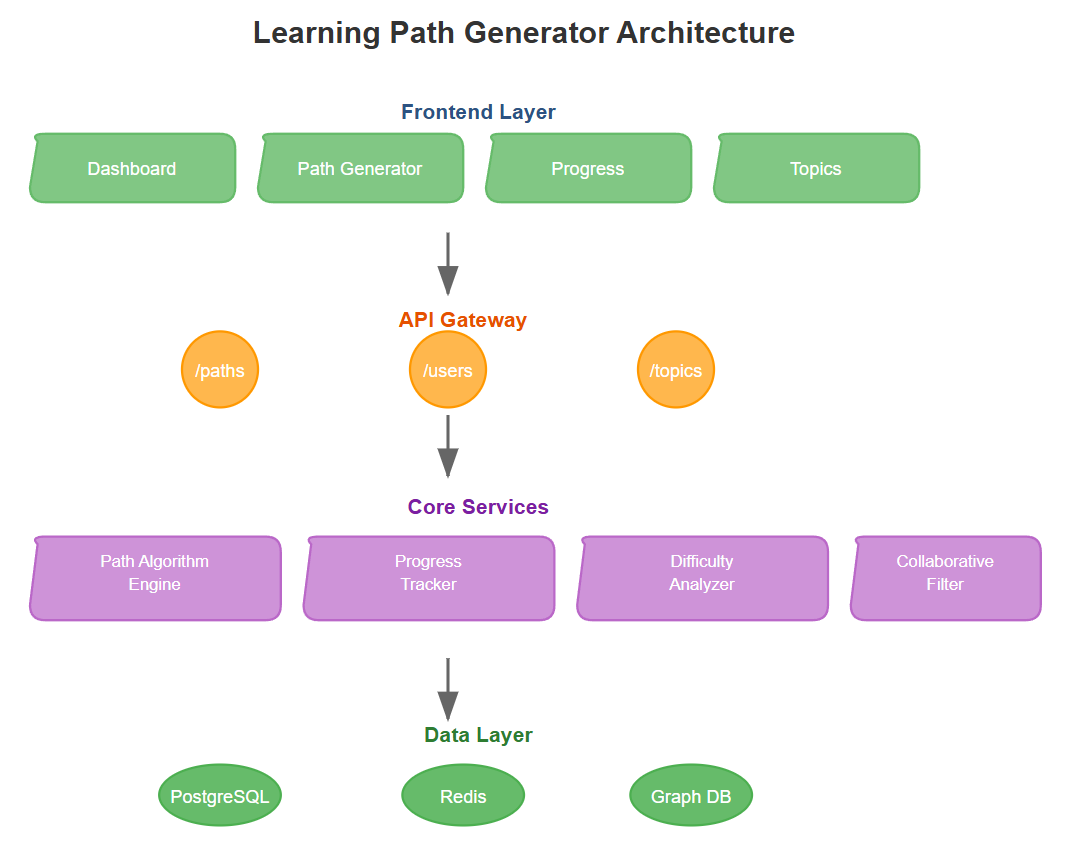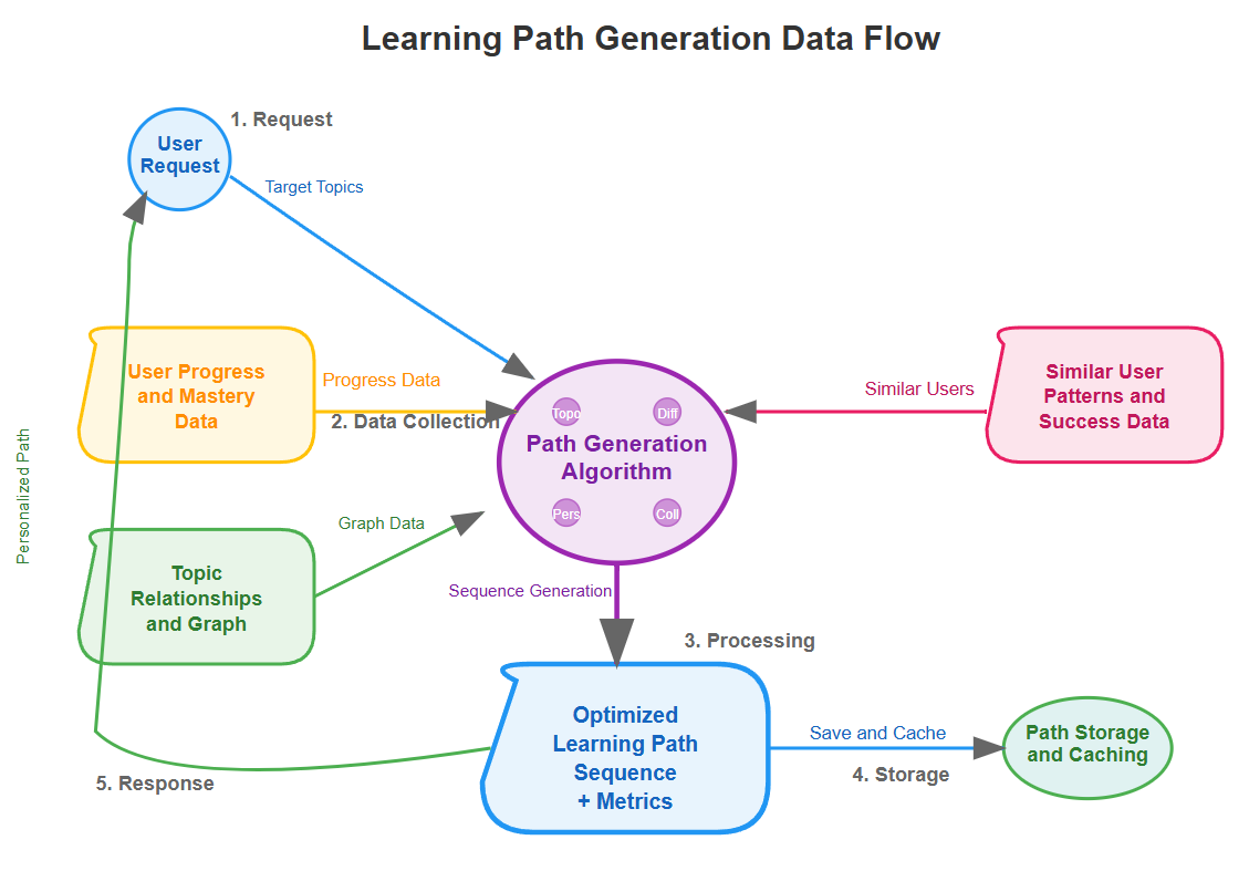 Our Learning Path Generator operates as a microservice that consumes topic relationships and user data to produce optimized learning sequences.