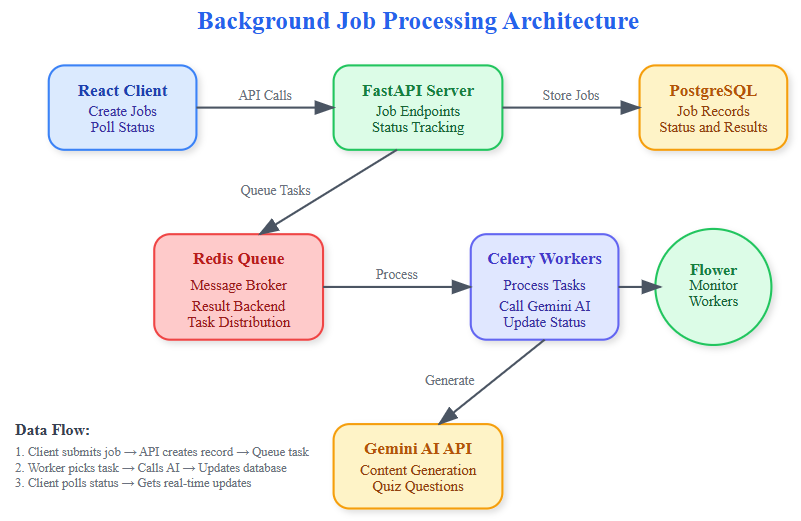 Remember waiting 30 seconds for ChatGPT to generate content? Without background jobs, your entire quiz platform would freeze every time someone requests AI-generated questions. Instagram processes millions of photo uploads this way - your upload appears instantly while AI analyzes it in the background.