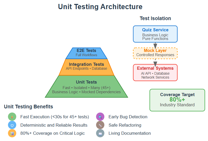 Real-World Context: When ChatGPT processes millions of requests daily, unit tests ensure each service component behaves predictably under various conditions. Your quiz platform needs the same reliability.