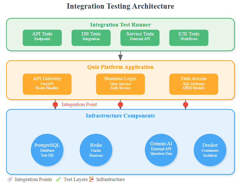 Today we're constructing an integration testing fortress around our Quiz Platform's API layer. Think of it as quality gates that verify every handshake between your components actually works in the wild—not just in isolation.