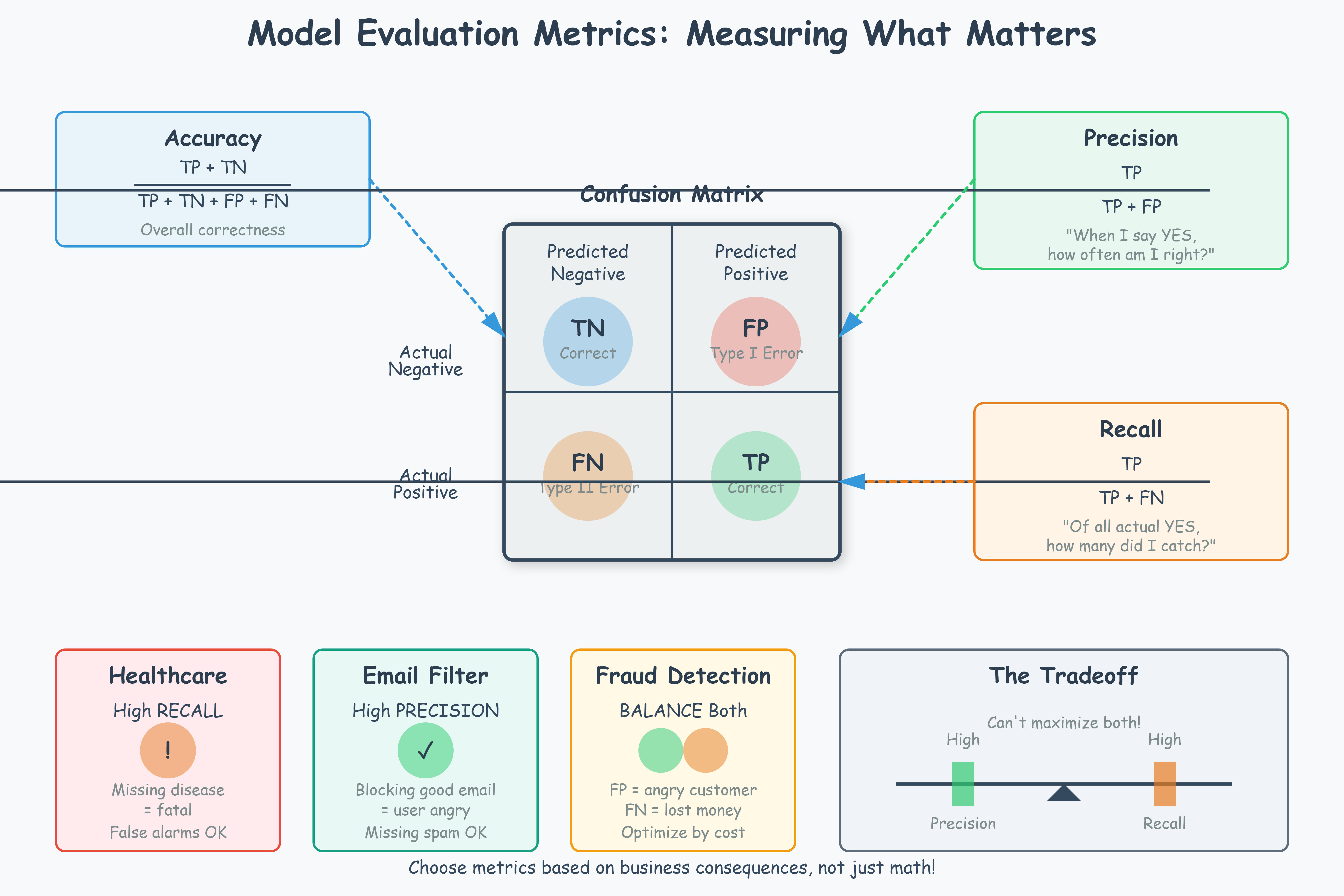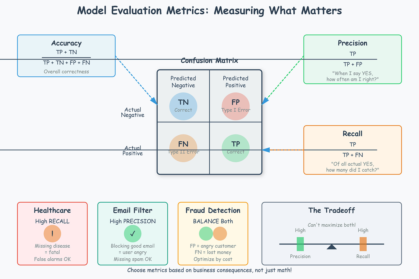 The problem? They optimized for accuracy when they should have optimized for recall. In healthcare, missing a sick patient (false negative) is catastrophically worse than over-cautious predictions (false positive). The hospital learned an expensive lesson: different problems need different metrics.