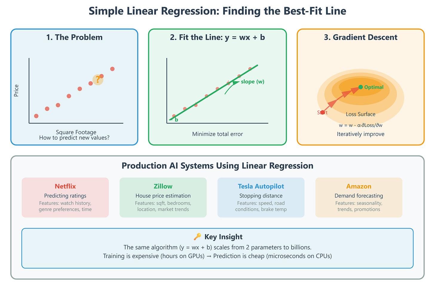 Every time Netflix predicts you’ll rate a movie 4.2 stars, Zillow estimates a house price, or Tesla’s autopilot calculates braking distance, linear regression is working behind the scenes. It’s the most widely deployed supervised learning algorithm in production AI systems.