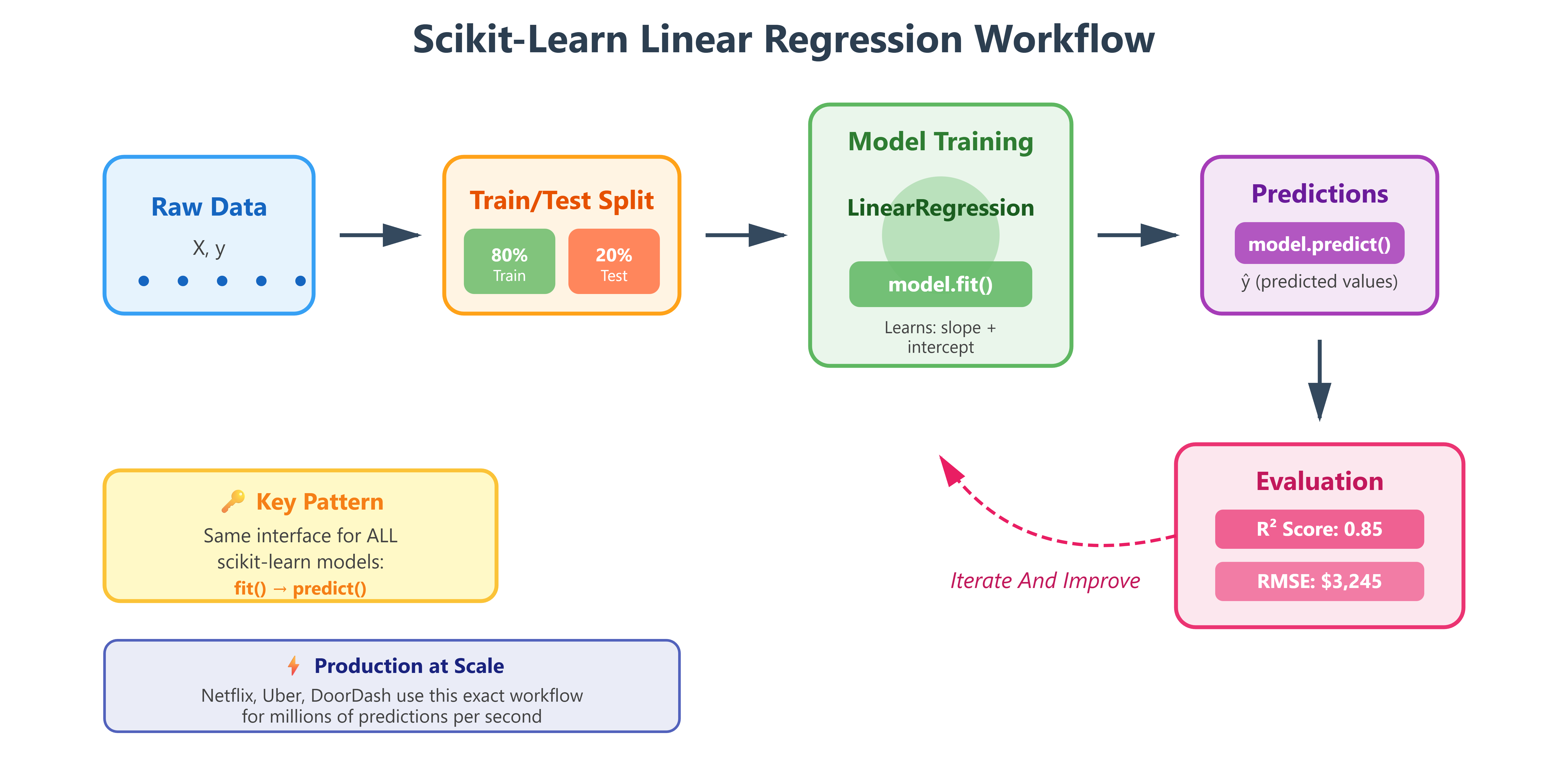 When Netflix predicts viewing time, when Uber estimates arrival times, or when Zillow forecasts home prices, they’re using the same scikit-learn patterns you’ll learn today. The library’s genius isn’t just simplicity—it’s standardization. Every model, whether linear regression or deep neural networks, follows the same fit/predict interface. Learn it once, use it everywhere.