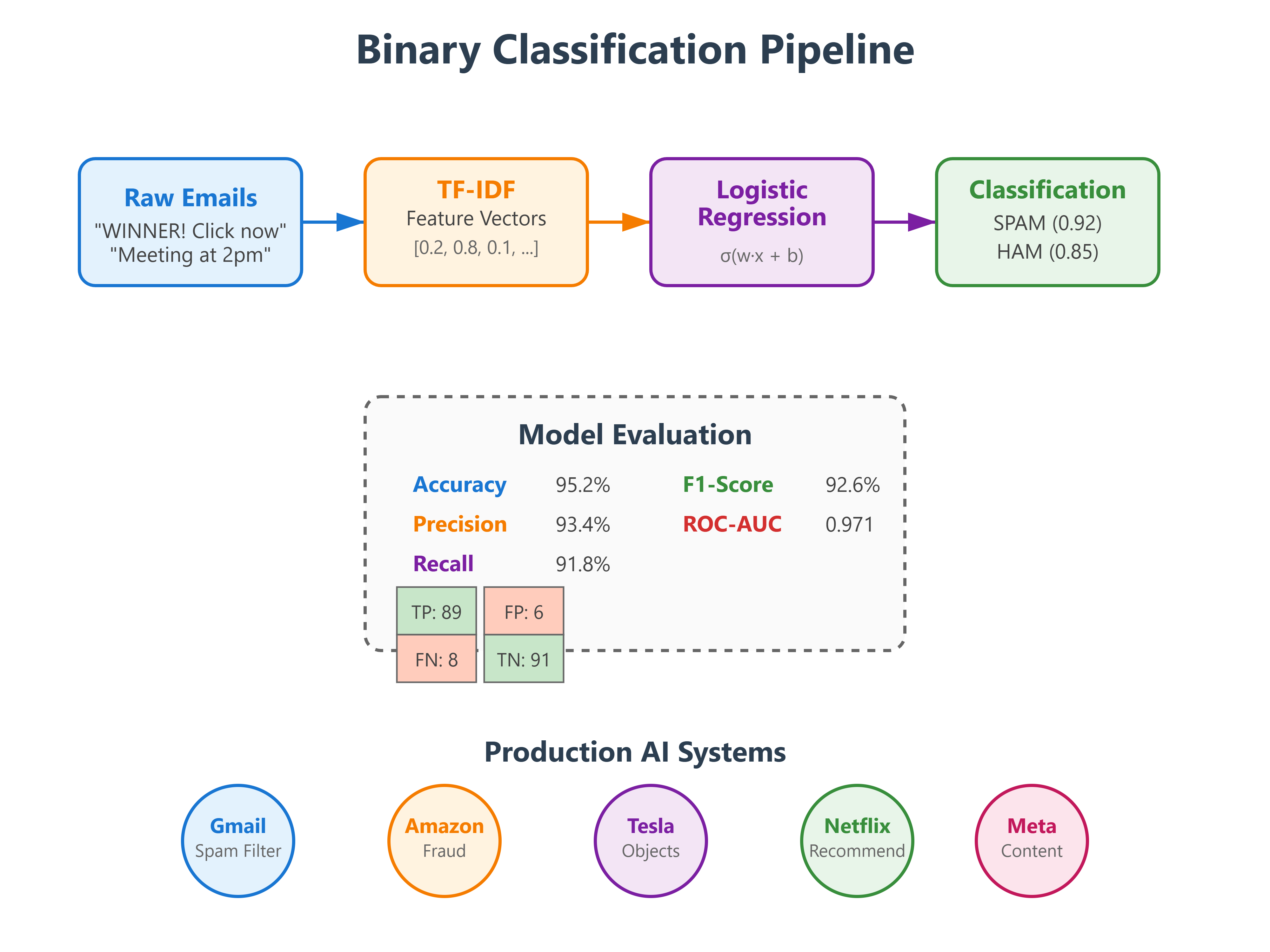 Every time Gmail decides whether an email is spam or not, Netflix determines if you’ll like a show, or Tesla’s autopilot classifies an object as pedestrian vs vehicle, they’re using binary classification. Yesterday we learned the math behind logistic regression. Today, we’re building the actual classifier that powers these decisions at scale.