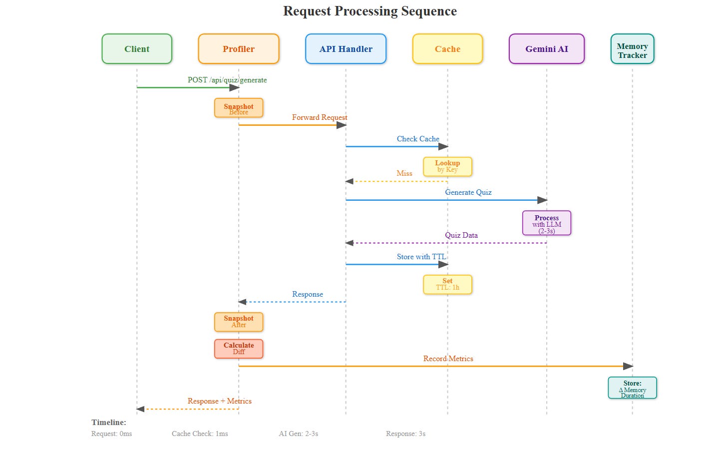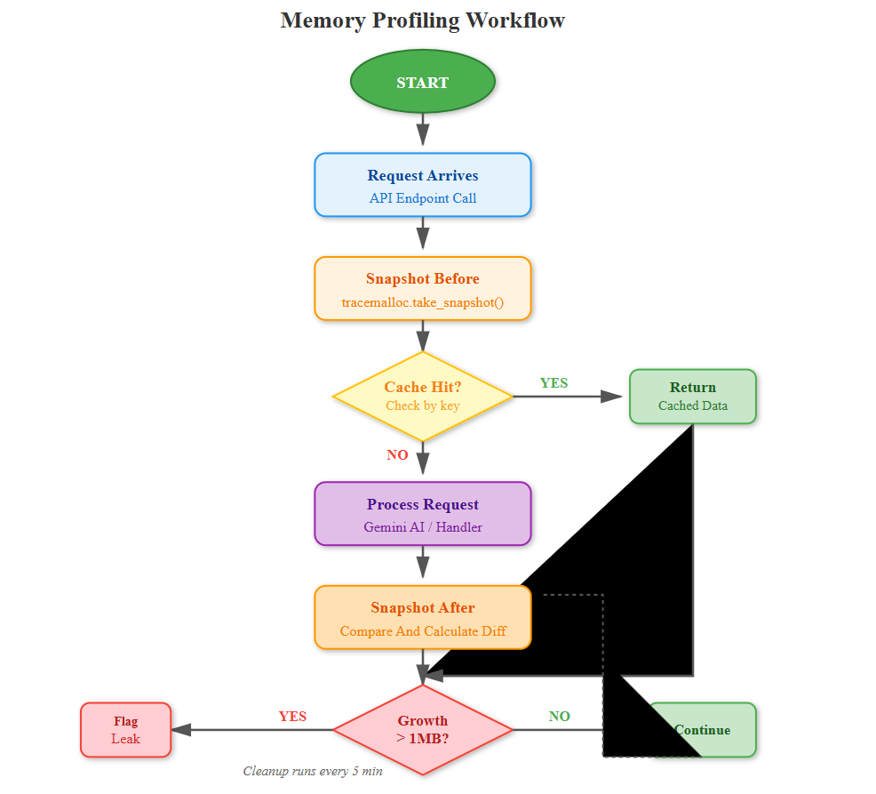 Request → Memory Profiler → API Handler → Gemini AI → Response Cache → Memory Tracker → Cleanup Scheduler → Response