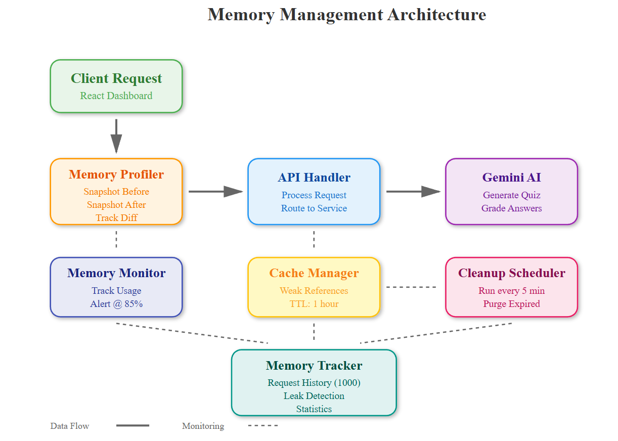 Your Quiz Platform uses Gemini AI to generate questions and grade responses. Each API call stores context, caches responses, and maintains user sessions. Without proper memory management, these accumulate like unopened browser tabs—eventually your server crashes.
