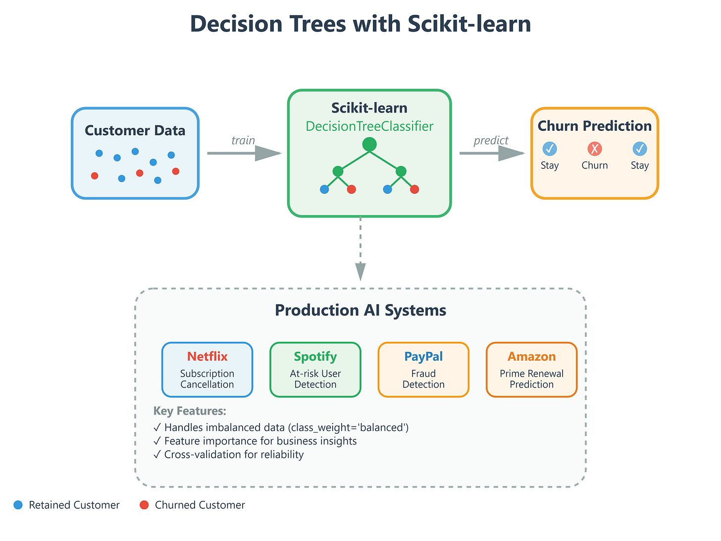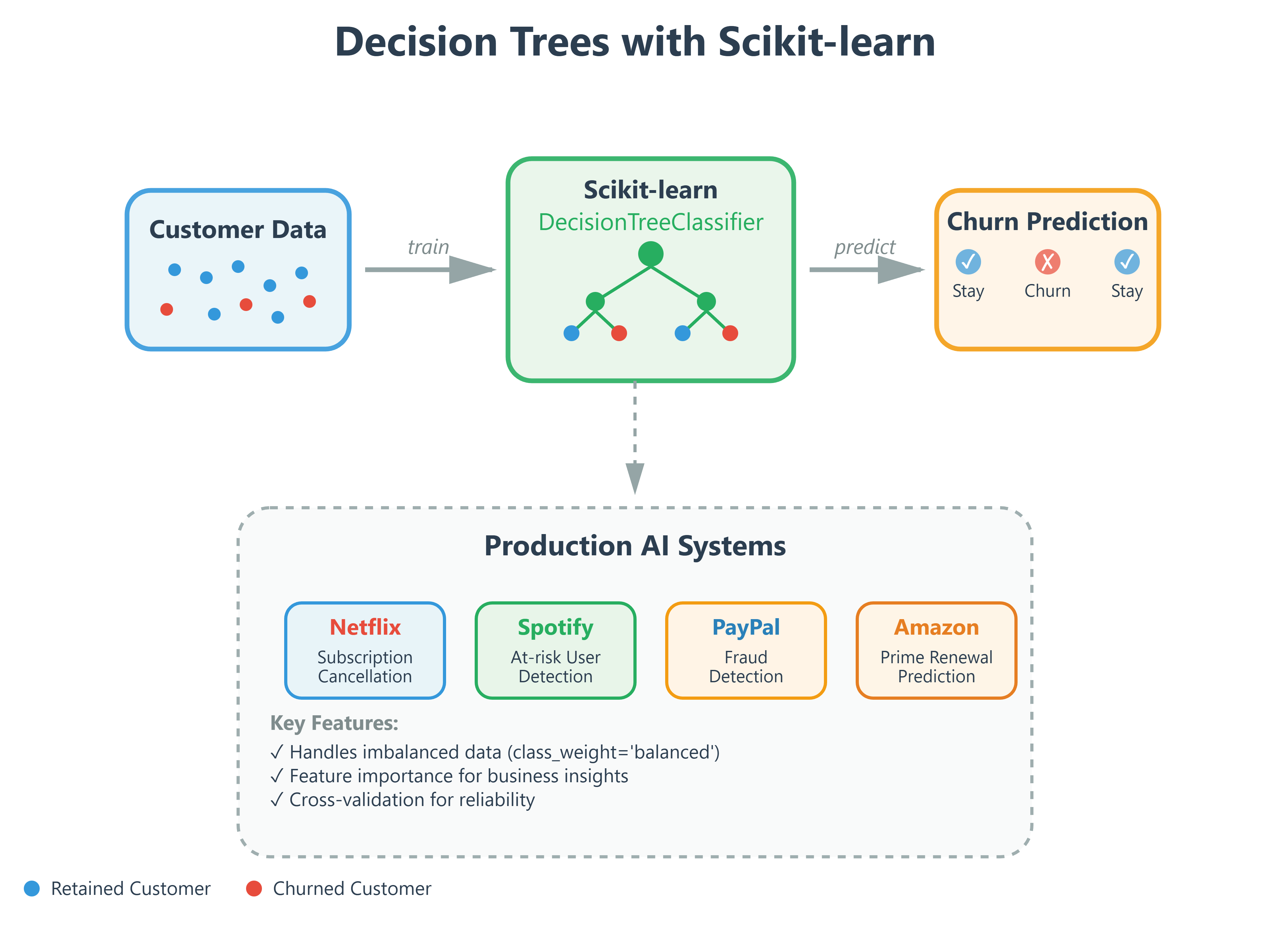 The difference between theory and production? Scikit-learn’s decision tree implementation is battle-tested, optimized, and handles edge cases you’d spend months discovering on your own. It’s what separates a concept you understand from a system that scales.