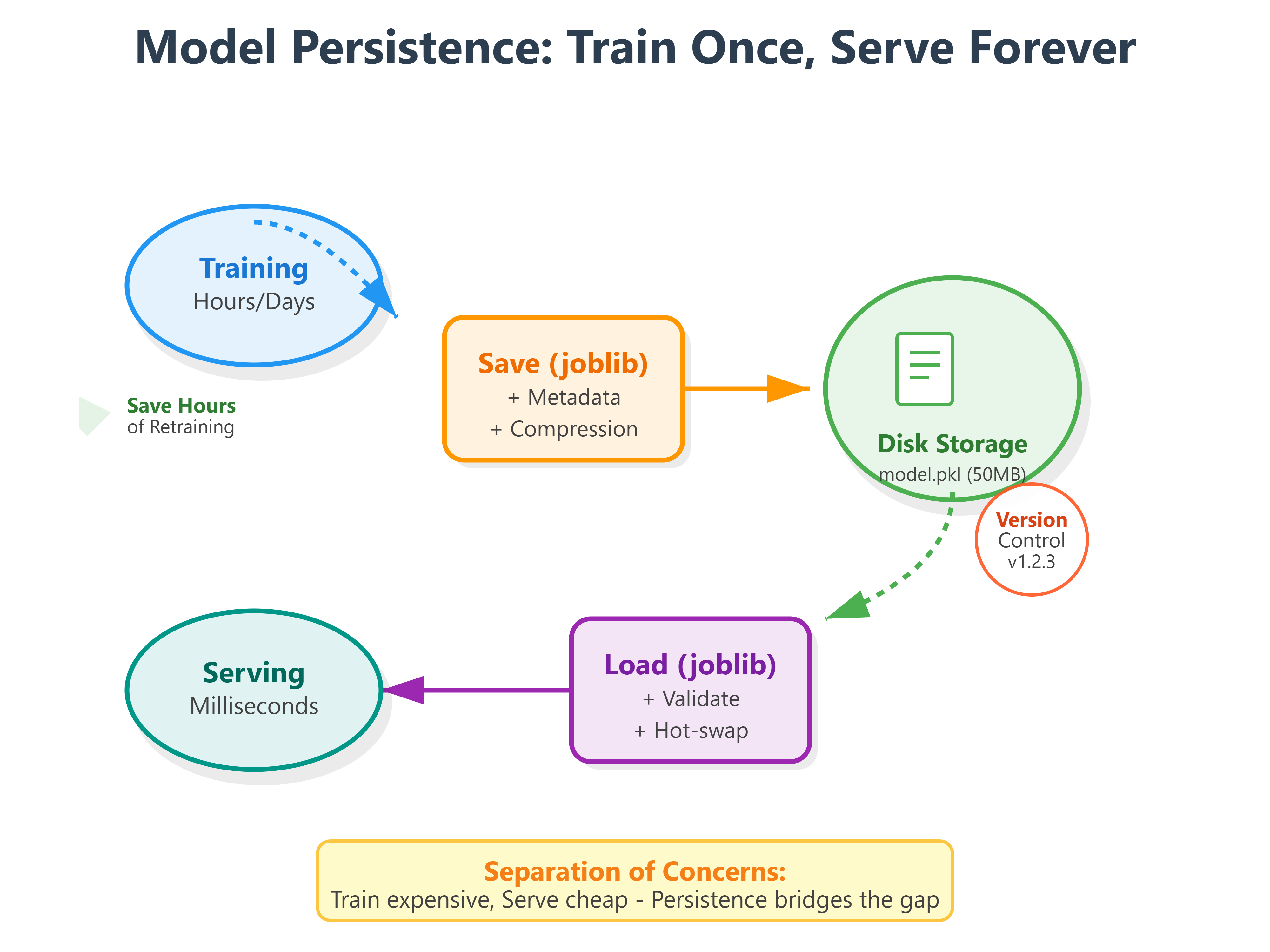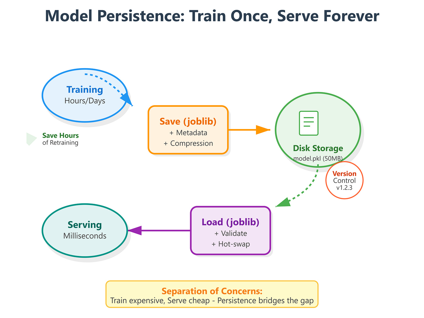 The pattern is universal: separate training (slow, expensive) from serving (fast, cheap). Persistence is the connection. A well-designed persistence system enables continuous model improvement without service disruption.